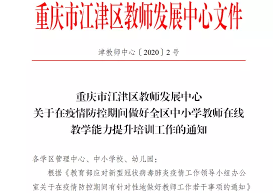江津區(qū)教師發(fā)展中心下發(fā)《關(guān)于在疫情防控期間做好全區(qū)中小學(xué)教師在線教學(xué)能力提升培訓(xùn)工作的通知(津教師中心〔2020〕2號(hào))》,強(qiáng)調(diào)各單位要充分利用“國(guó)培計(jì)劃”學(xué)習(xí)平臺(tái),積極引導(dǎo)、鼓勵(lì)教師充分利用網(wǎng)絡(luò)平臺(tái)免費(fèi)開(kāi)放共享的優(yōu)質(zhì)教師培訓(xùn)課程,自主選學(xué),開(kāi)展線上自主研修。區(qū)內(nèi)63所學(xué)校1069名教師參與到了此次培訓(xùn)中。