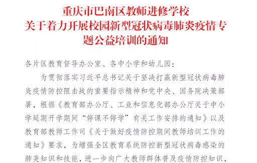 為進(jìn)一步向廣大教師群體普及疫情防控知識(shí),提高防范意識(shí),掌握疫情防控技能,重慶市中小學(xué)教師發(fā)展中心攜手高教社教師發(fā)展中心,面向重慶市廣大中小學(xué)幼兒園教職工開(kāi)展校園防控新型冠狀病毒肺炎疫情專題公益培訓(xùn)。