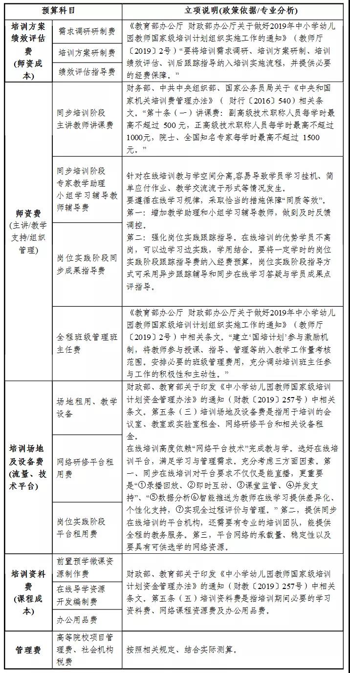 各省要依據(jù)教育部教師工作司、財務(wù)司關(guān)于印發(fā)《中小學(xué)幼兒園教師在線培訓(xùn)實(shí)施指南》的通知要求“經(jīng)費(fèi)成本包括師資成本、課程使用成本、流量成本、技術(shù)平臺成本、學(xué)習(xí)支持成本、組織管理成本、管理費(fèi)(稅費(fèi))成本等”。